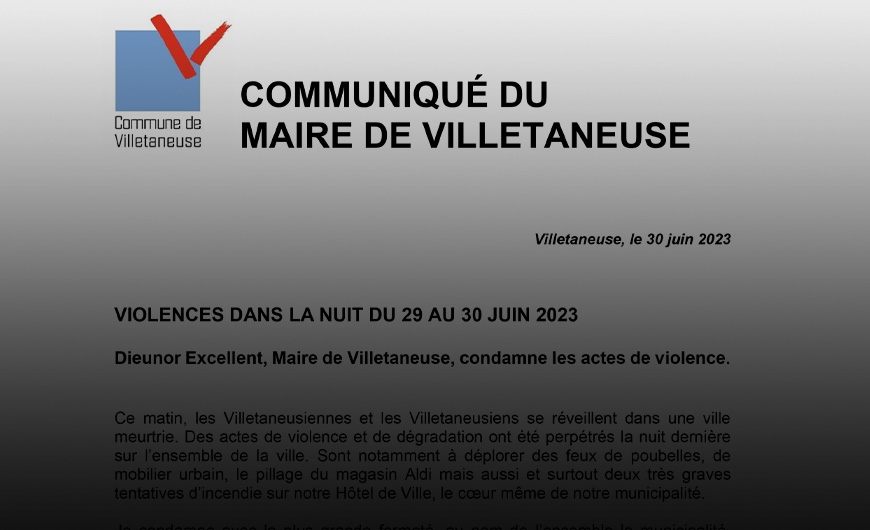 Ce matin, les Villetaneusiennes et les Villetaneusiens se réveillent dans une ville meurtrie. Des actes de violence et de dégradation ont été perpétrés la nuit dernière sur l’ensemble de la ville. Sont notamment à déplorer des feux de poubelles, de mobilier urbain, le pillage du magasin Aldi mais aussi et surtout deux très graves tentatives d’incendie sur notre Hôtel de Ville, le cœur même de notre municipalité.