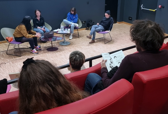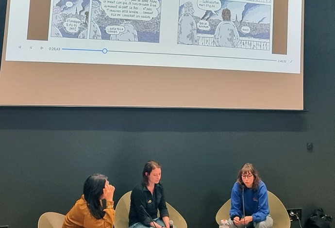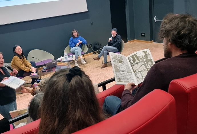 "Dans l’auditorium Zaïma Hamnache de la médiathèque et dans le cadre du festival « Hors Limite », trois auteurs de bande dessinée, avec trois visions bien différentes de la banlieue où ils sont nés, ont échangé sur la genèse de leur talent, sur leurs inspirations, sur leur goût pour l’architecture, sur les messages qu’ils veulent porter. Il y avait Gilles ROCHIER, un dessinateur autodidacte « pessimiste sentimental », qui a débuté avec le fanzine et qui maintenant édite régulièrement de petites saynètes autobiographiques pleines d’humour noir. Il y avait aussi Kei LAM, une autrice à la double culture chinoise et française qui, elle aussi, se met en scène en se nourrissant de son quotidien vécu notamment sur la dalle de La Noue à Bagnolet, avec cette exigence de vouloir lutter contre les clichés et les préjugés sur les zones périphériques. Et il y avait enfin, Chloé WARY, toute jeune autrice en résidence artistique sur notre commune qui compte déjà trois ouvrages édités et deux prix prestigieux remportés, qui notamment colorise nos faubourgs au feutre, dessine aussi des histoires de femmes qui se battent dans des univers d’hommes, ou bien encore aborde la musique de Beethoven aux pieds des cités. Un beau moment d’échanges sincères sur leur travail d’auteur."
