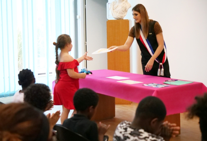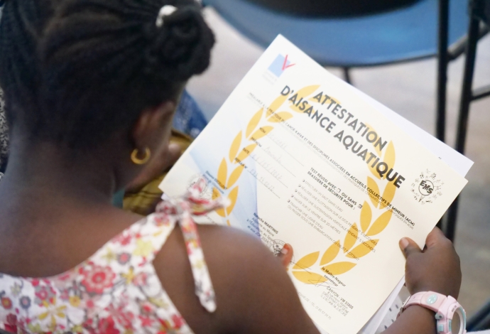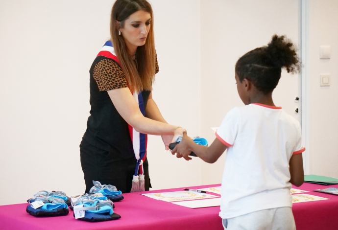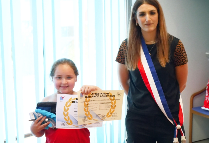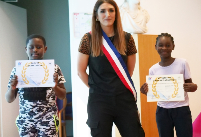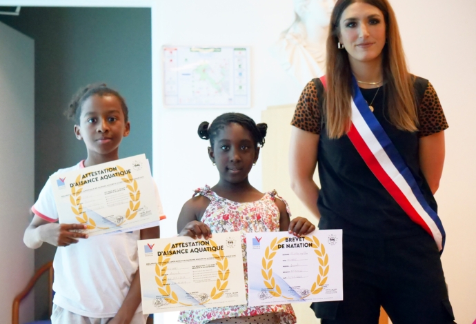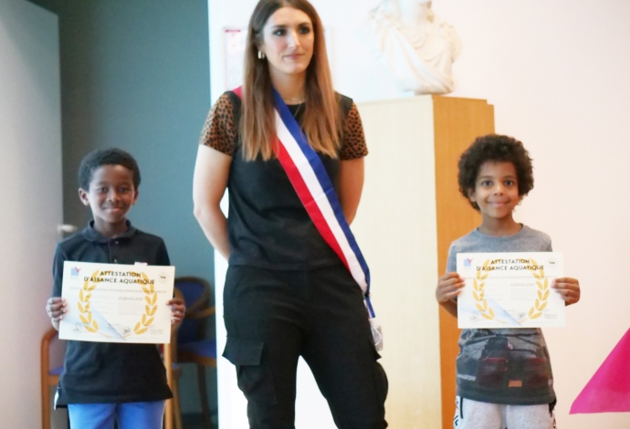 Le 15 juin dernier, la Municipalité a remis à une dizaine de jeunes villetaneusiens et villetaneusiennes un diplôme d’aisance aquatique et/ou de brevet 50 mètres nage, suite aux stages organisés par l’École Municipale du Sport (EMS) lors des vacances de la Toussaint 2021 et printemps 2022. Natacha MARTINIS, Adjointe au Maire déléguée à l’éducation, au sport et aux Jeux Olympiques de Paris 2024, a prononcé un discours face aux enfants accompagnés de leur parents et a remis à chaque enfant son diplôme avec, en cadeau à chacun, un kit de natation (pochette de rangement, lunettes de piscine et bonnet de bain). Bravo à eux !