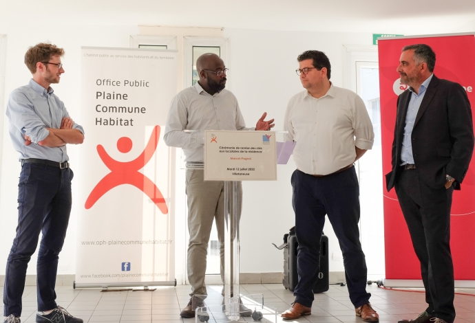 Mardi 12 juillet 2022, M. le Maire de Villetaneuse, Dieunor EXCELLENT était présent à la résidence Marcel-Pagnol pour une cérémonie de remise de clés auprès des nouveaux locataires. Ces anciens logements du CROUS de Créteil ayant accueilli des étudiants du territoire, ont été réhabilités par Plaine Commune Habitat pour accueillir de nouveaux Villetaneusiens, en particulier, des ouvriers travaillant sur les chantiers du Grand Paris et de Paris 2024. M. Le Maire a visité quelques appartements pour voir la qualité des rénovations et s'entretenir avec des locataires. C'est avec émotion que le Maire a remis les clés aux nouveaux arrivants puis énoncé un discours de bienvenue auprès des nouveaux habitants de Villetaneuse. La remise en état de ce bâtiment et l'accueil de ces nouveaux Villetaneusiens est une fierté pour tous les acteurs impliqués, car ce projet va permettre l'arrivée de nouveaux Villetaneusiens qui vont contribuer à la dynamique du territoire de la Seine-Saint-Denis. À la fin des discours, les convives ont partagé ensemble un buffet convivial pour clôturer cette célébration.