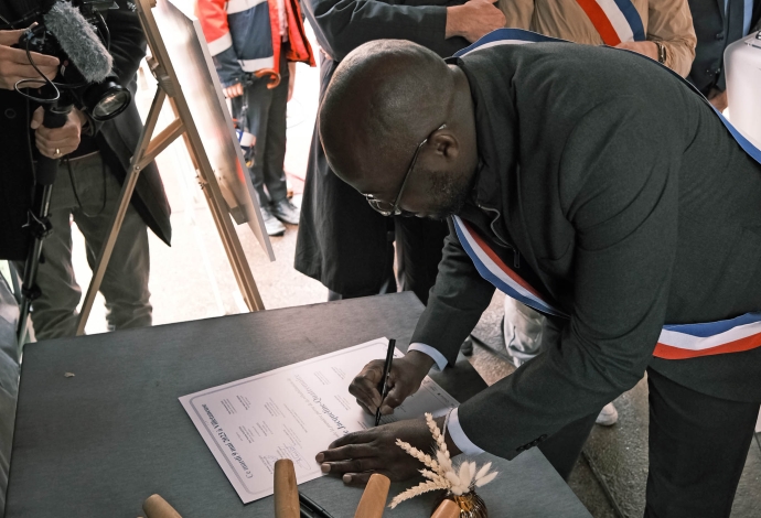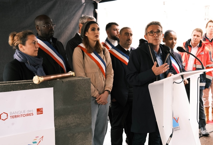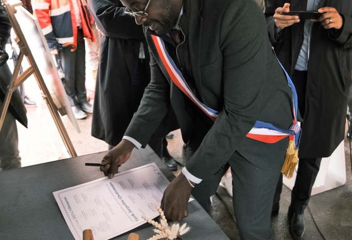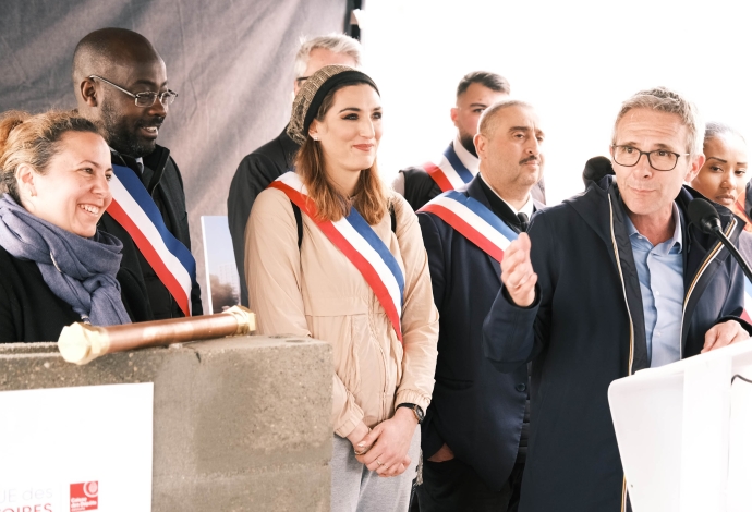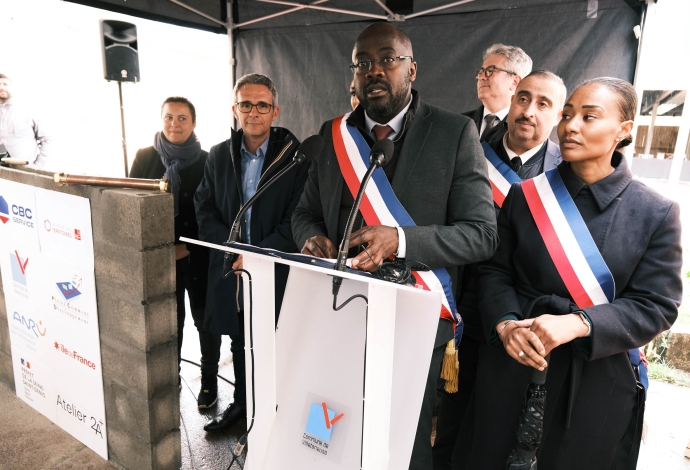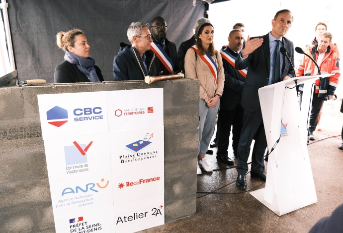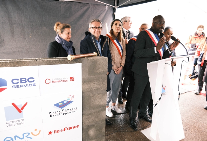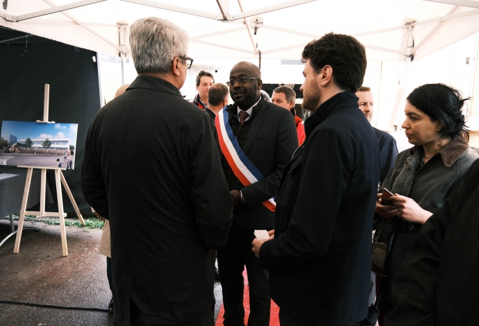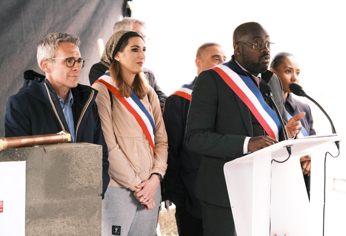 Le 9 mai dernier, la Municipalité posait la première pierre du programme de rénovation et d’extension de l’école Jacqueline-Quatremaire. Dieunor Excellent, le Maire, entouré de ses adjoint·e·s Natacha Martinis, Hassanatou Bah, Majide Ammad et Fayçal Bougria, a rappelé les circonstances qui ont causé le retard de cette réhabilitation et a insisté sur la qualité du nouveau projet qui s’appuie désormais sur un programme plus ambitieux en termes de durabilité et d’environnement. Il était, bien sûr, accompagné des partenaires institutionnels qui soutiennent et financent en partie ce programme : le sous-Préfet de Seine-Saint-Denis Vincent Lagoguey, le Président du Conseil départemental de la Seine-Saint-Denis et de Plaine Commune Développement, Stéphane Troussel, la vice-présidente du Conseil départemental de la Seine-Saint-Denis, Florence Laroche, le Directeur général délégué de la Caisse des Dépôts et Directeur de la Banque des Territoires, Olivier Sichel, et des architectes de l’Atelier 2+A, Florence Grall et Louis Jonathan.