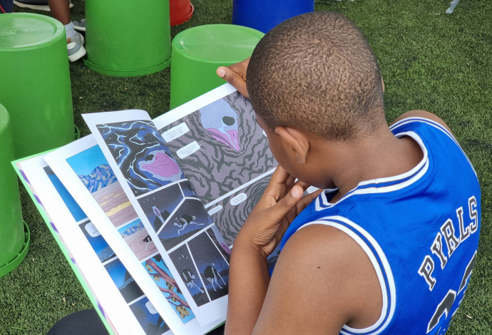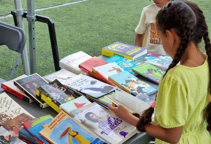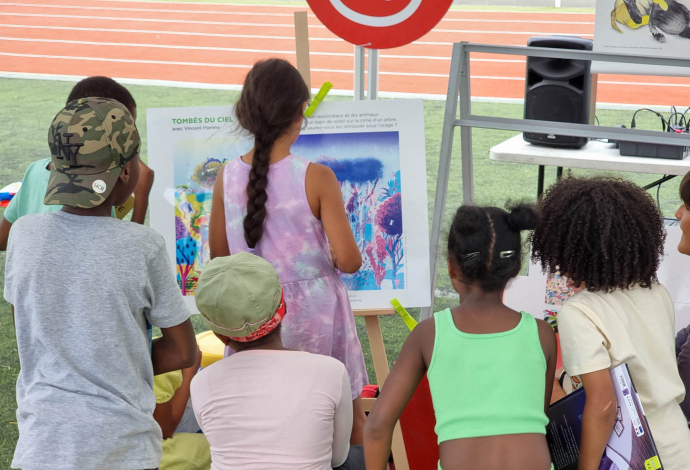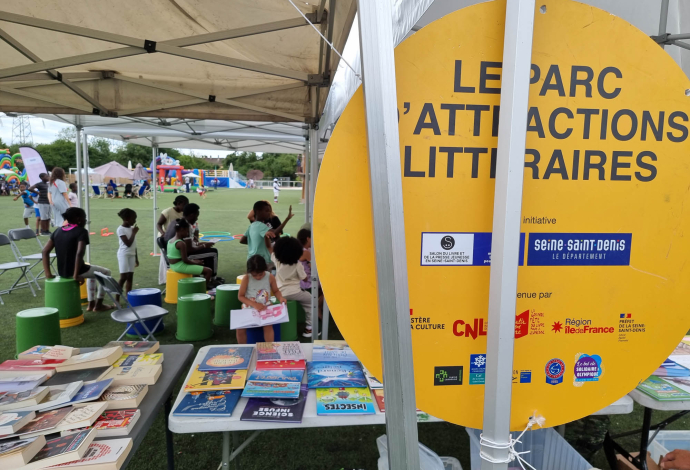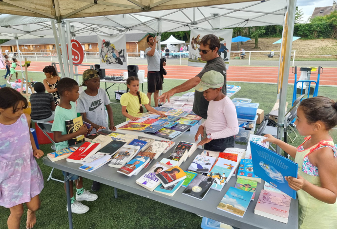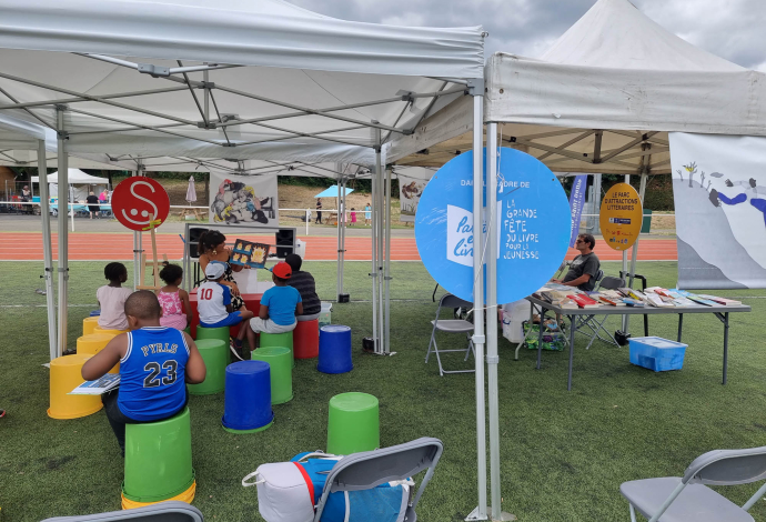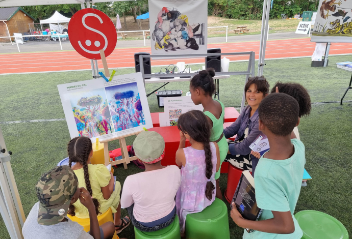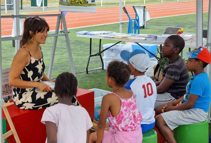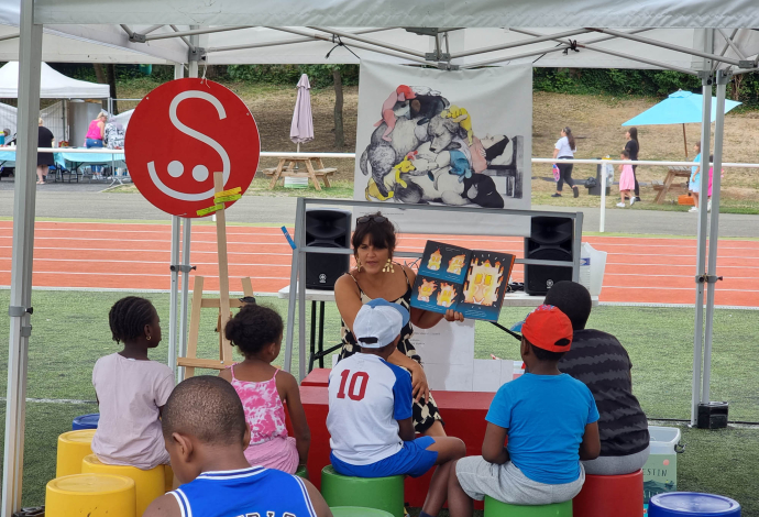 Instant lecture le 19 juillet 2023 au stade Bernard-Lama dans le cadre de « L'Été à Villetaneuse » pour les jeunes villetaneusiennes et villetaneusiens grâce au Parc d'attractions littéraires du Salon du Livre et de la Presse Jeunesse.