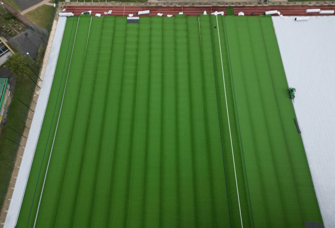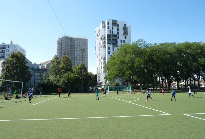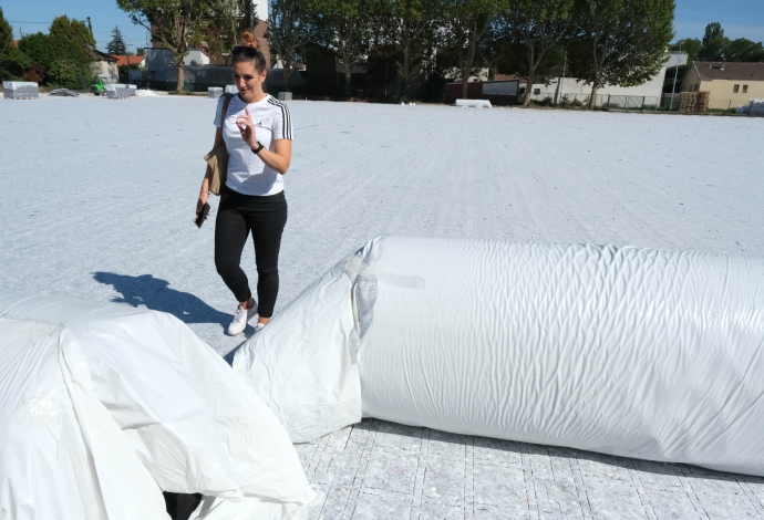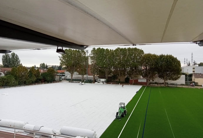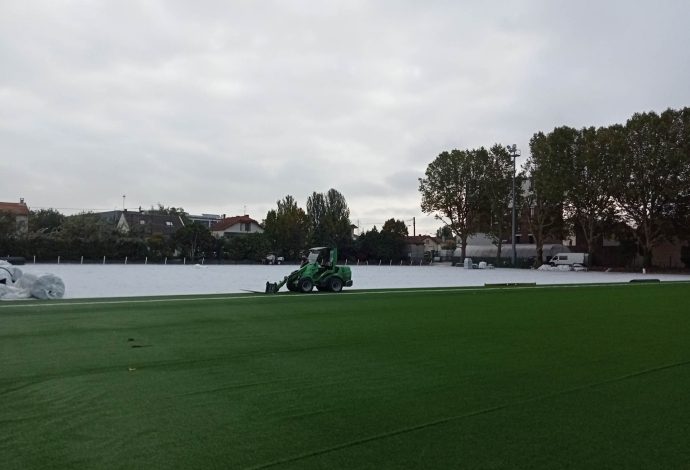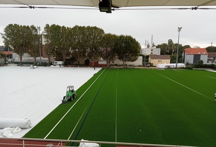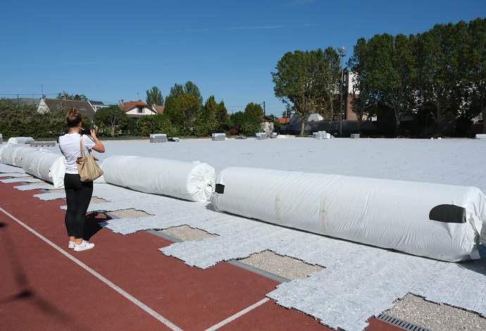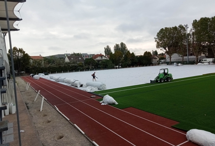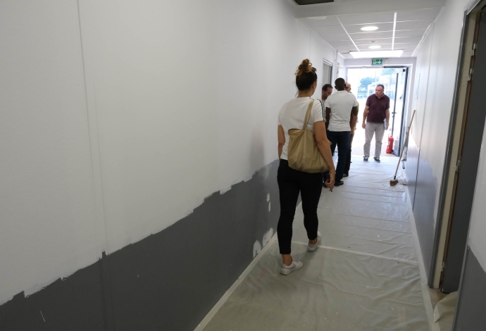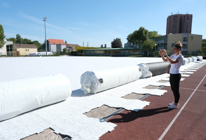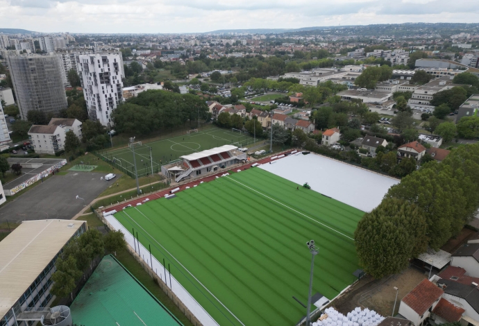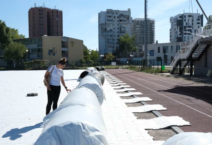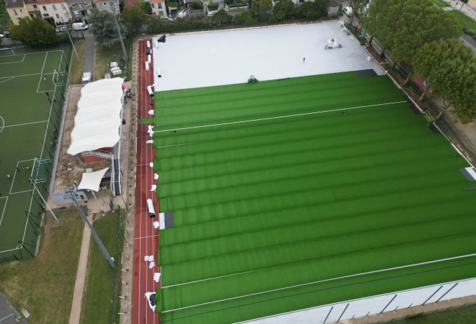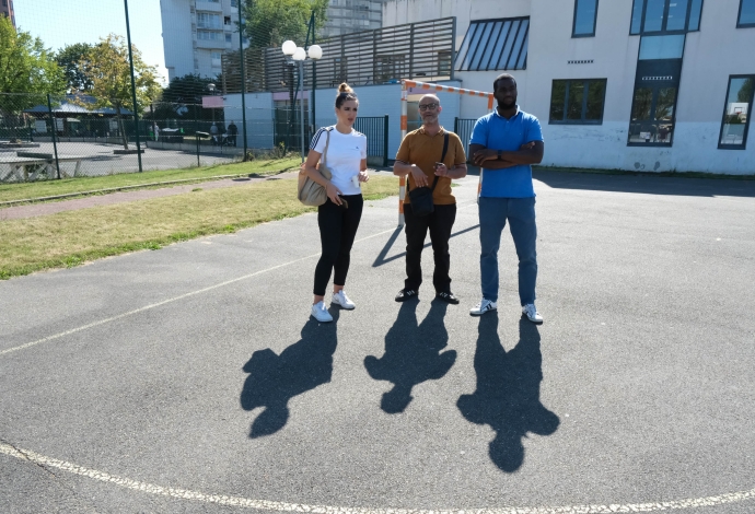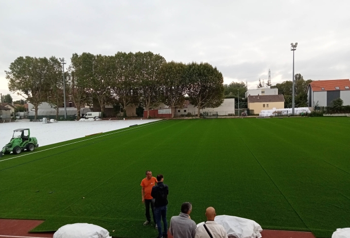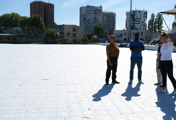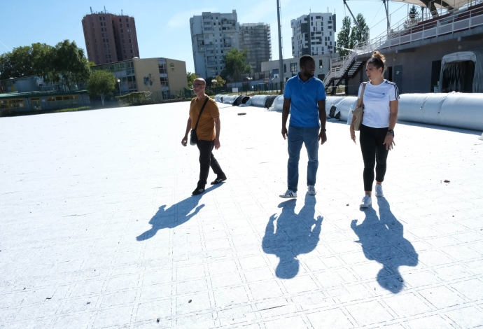 Natacha Martinis, adjointe au maire déléguée à l'éducation, aux sports et aux Jeux Olympiques et Paralympiques de Paris 2024 et Salif Sidibé, conseiller municipal délégué au développement des pratiques sportives, ont visité l'avancée de la rénovation du stade Dian de Villetaneuse le 6 septembre 2023.
