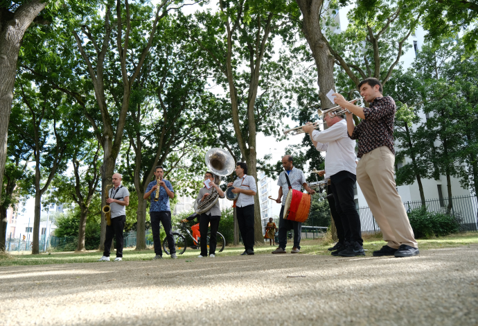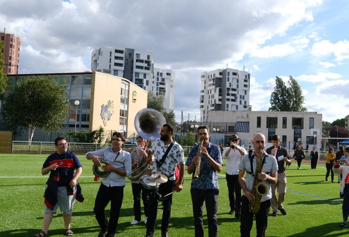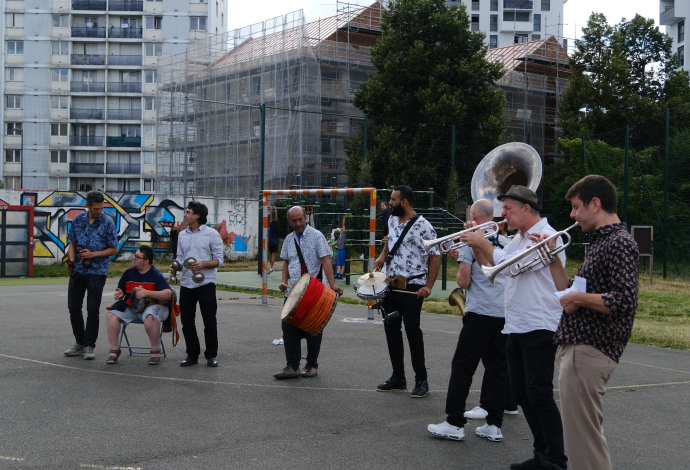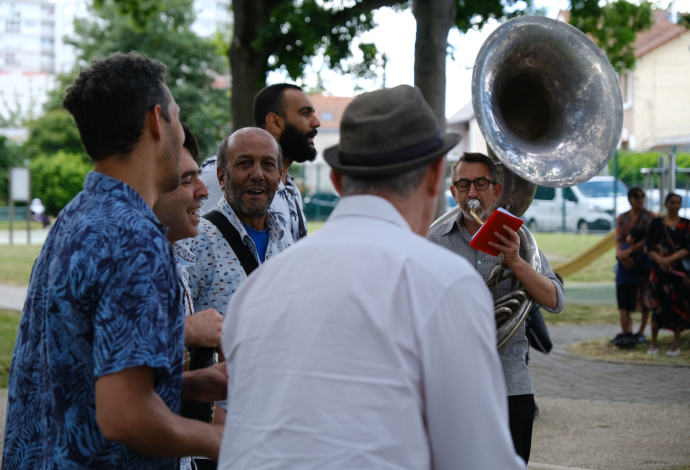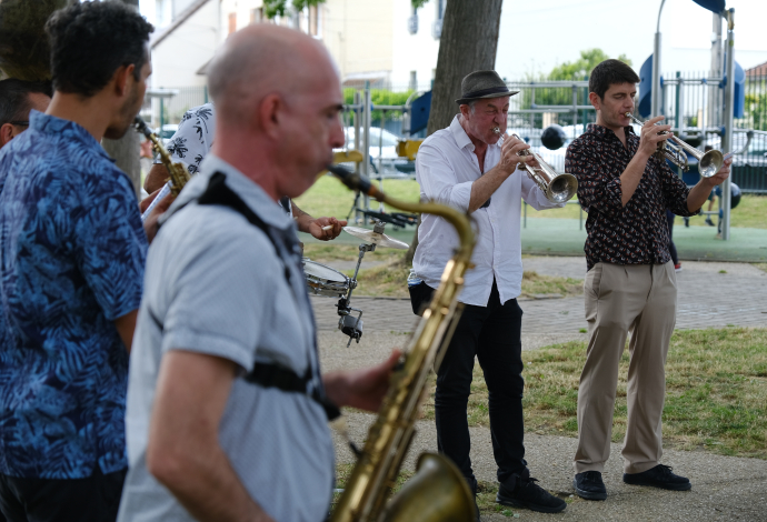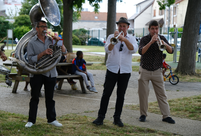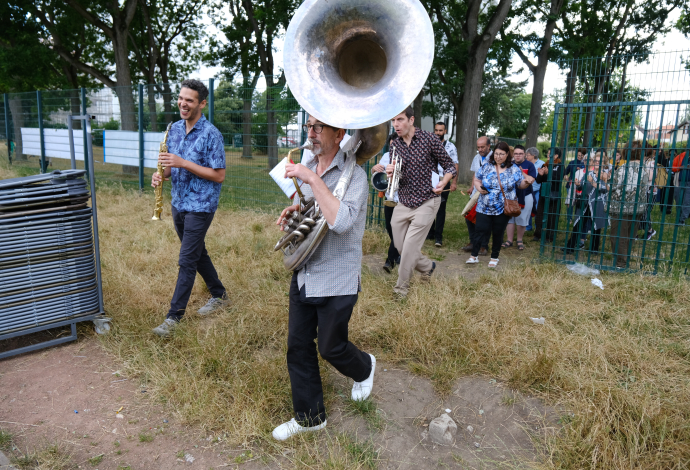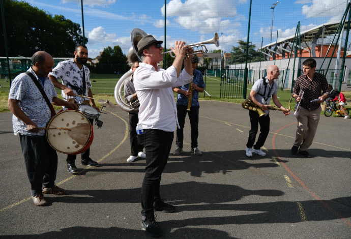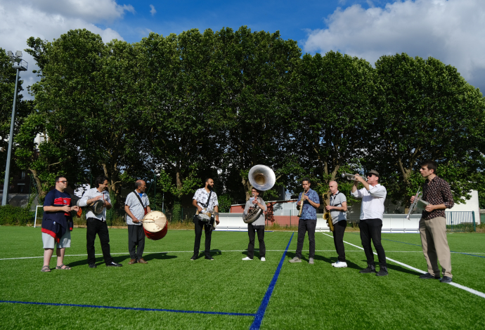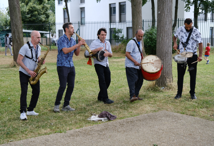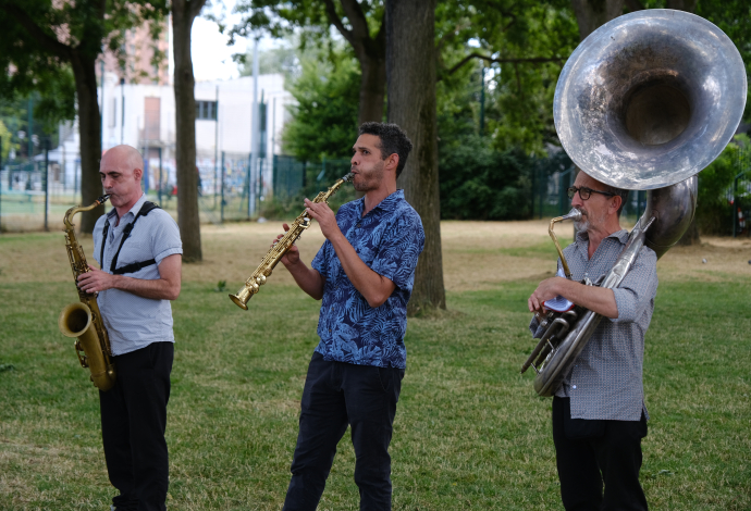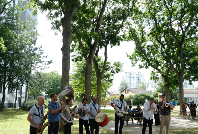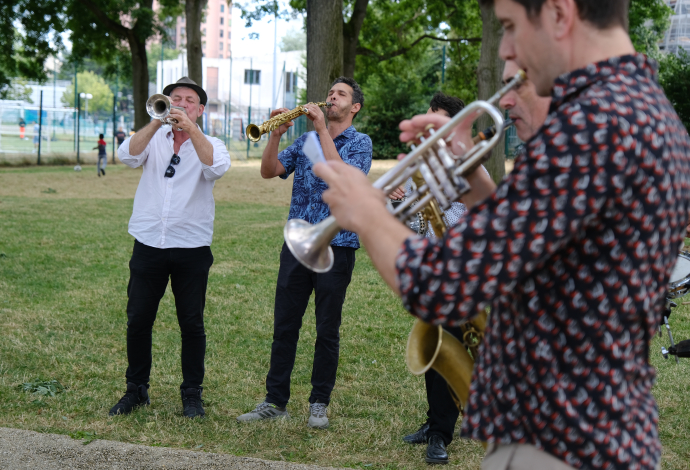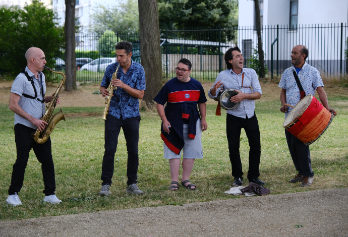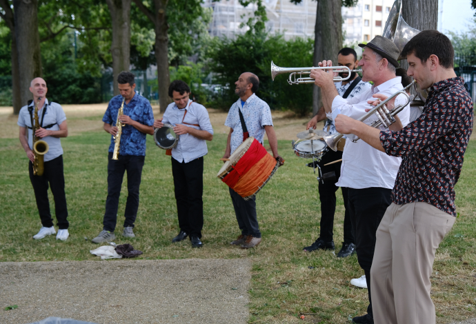 Samedi 6 juillet, dans le cadre du Festival Métis/Plaine Commune, à l’ombre des épicéas du Parc Carnot, un musicien du groupe Fanfaraï Big Band a mené un petit atelier d’initiation aux percussions indiennes auprès de jeunes enfants. Puis, les musiciens ont pris le relais et se sont installés à leur tour sous les arbres du parc pour débuter un concert coloré mêlant au rap, chai et autre gnawi, des cuivres jazz, afro-cubains ou tziganes. Une déambulation festive du big band a suivi du parc au stade Dian accompagné d’un petit groupe d’habitants. Le concert s’est achevé en plein soleil, au centre du terrain. Un bien joli moment avec une musique chaloupée, généreuse, virevoltante !