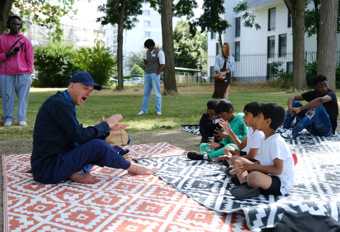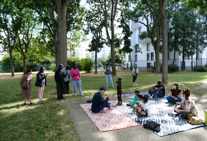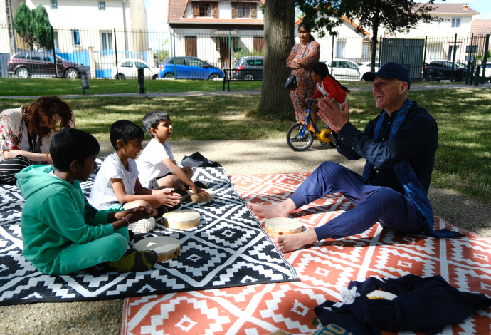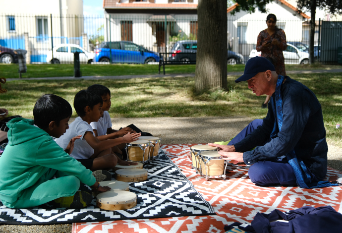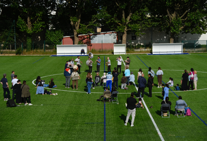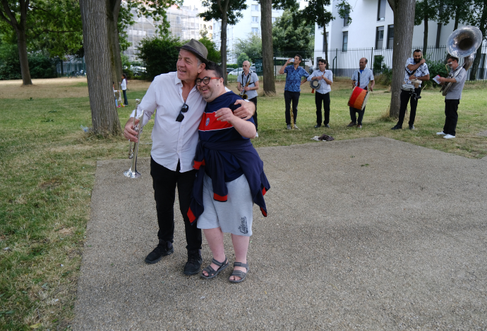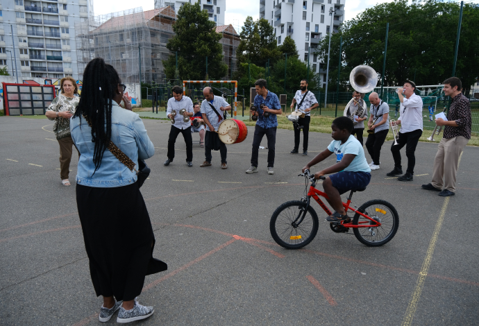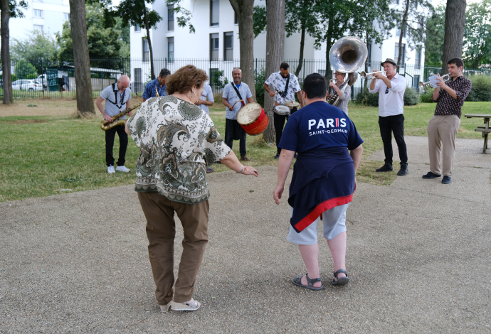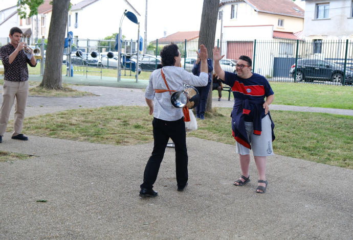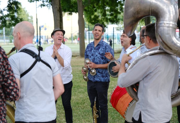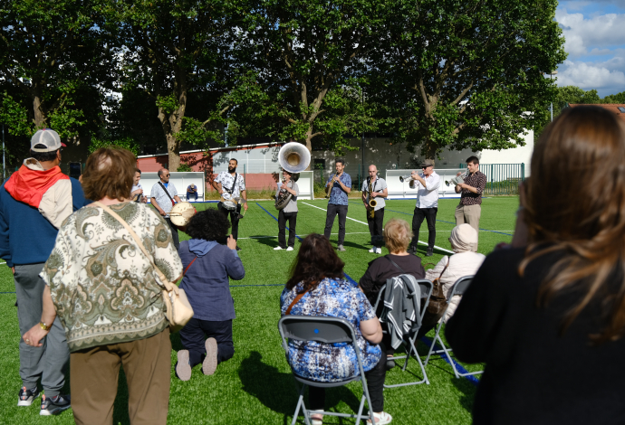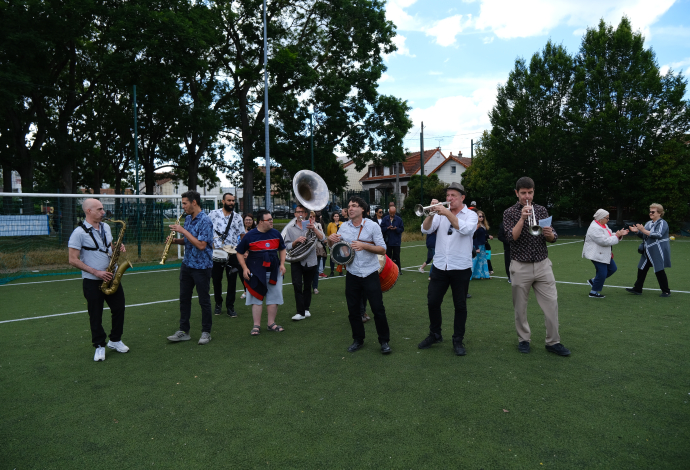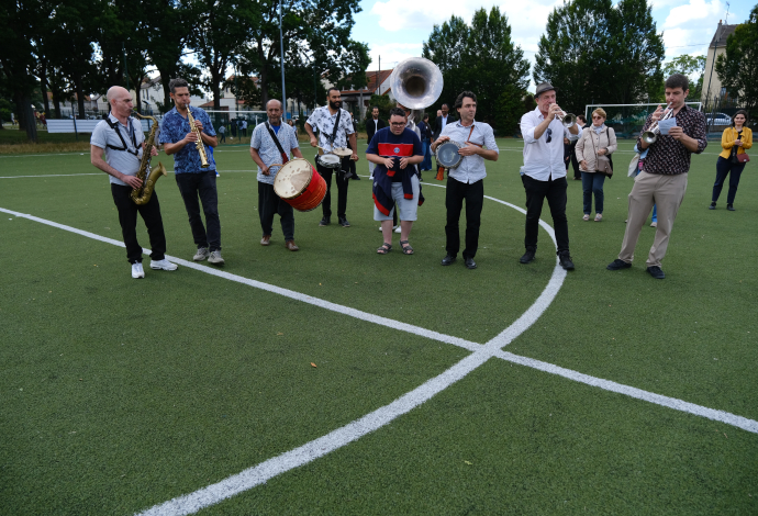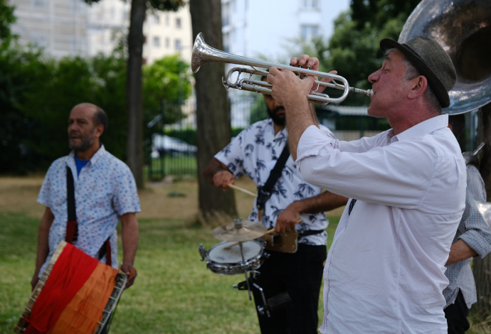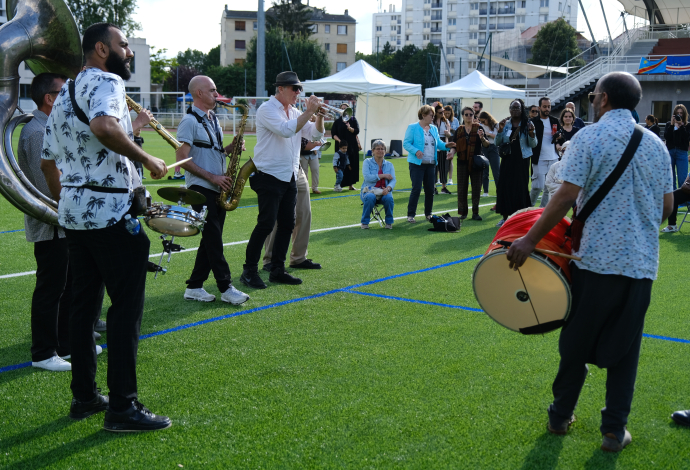 Samedi 6 juillet, dans le cadre du Festival Métis/Plaine Commune, à l’ombre des épicéas du Parc Carnot, un musicien du groupe Fanfaraï Big Band a mené un petit atelier d’initiation aux percussions indiennes auprès de jeunes enfants. Puis, les musiciens ont pris le relais et se sont installés à leur tour sous les arbres du parc pour débuter un concert coloré mêlant au rap, chai et autre gnawi, des cuivres jazz, afro-cubains ou tziganes. Une déambulation festive du big band a suivi du parc au stade Dian accompagné d’un petit groupe d’habitants. Le concert s’est achevé en plein soleil, au centre du terrain. Un bien joli moment avec une musique chaloupée, généreuse, virevoltante !