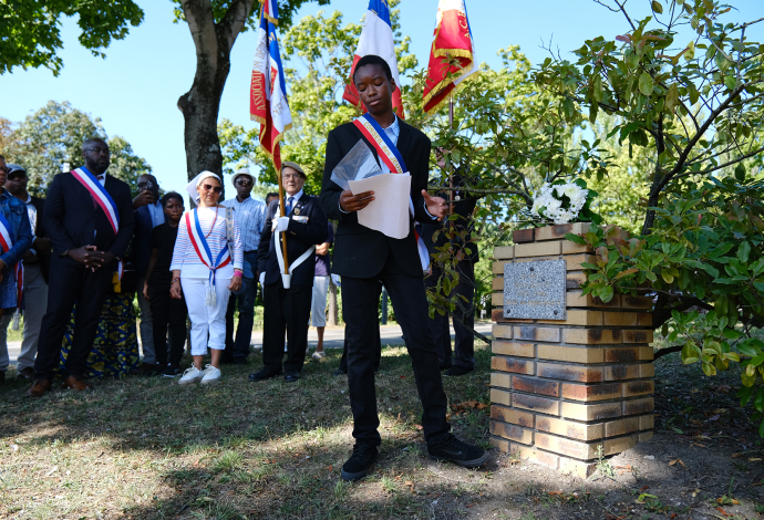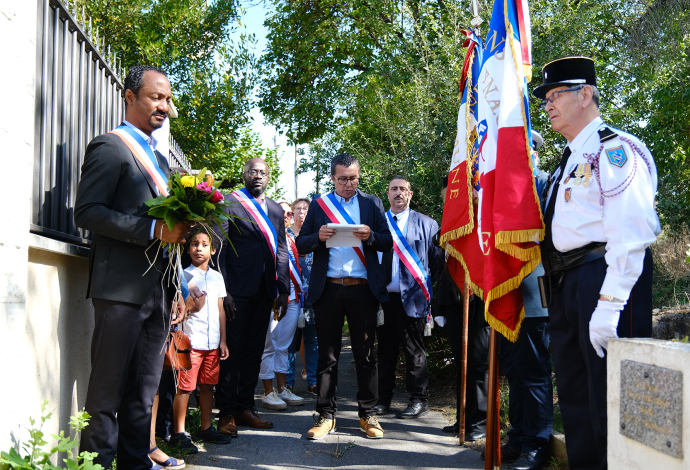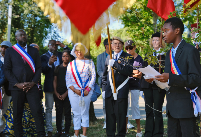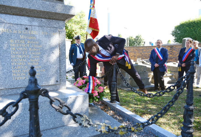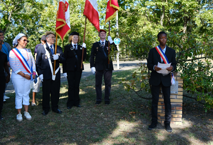 Le mardi 27 août 2024, à l’occasion de la commémoration du 80e anniversaire de la Libération de Villetaneuse, le Maire, Dieunor EXCELLENT et l’ensemble de la Municipalité invitaient les habitants à se recueillir sur les stèles de Maurice GRANDCOING, Ernest SIEGRIST, Delphine PRESSET, Gaston NOREUX, Yvon LECLERCQ et Pierre LOUIS, six résistants Villetaneusiens ayant fait de leur vie le sacrifice ultime pour libérer la France de la barbarie nazie. Bakary WAGUE, élu au Conseil des Jeunes, a ainsi rendu un hommage particulier à Pierre LOUIS en lisant un texte très émouvant écrit par son petit neveu Philippe DHENEIN. L’hommage aux six résistants s’est ensuite poursuivi sur le parvis de l’Hôtel de Ville avec le discours de Dieunor EXCELLENT, Maire de Villetaneuse.