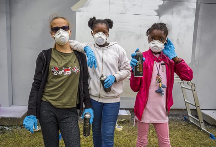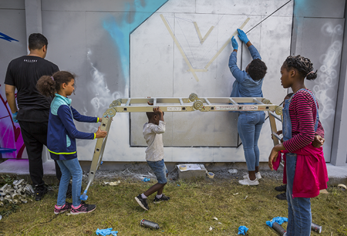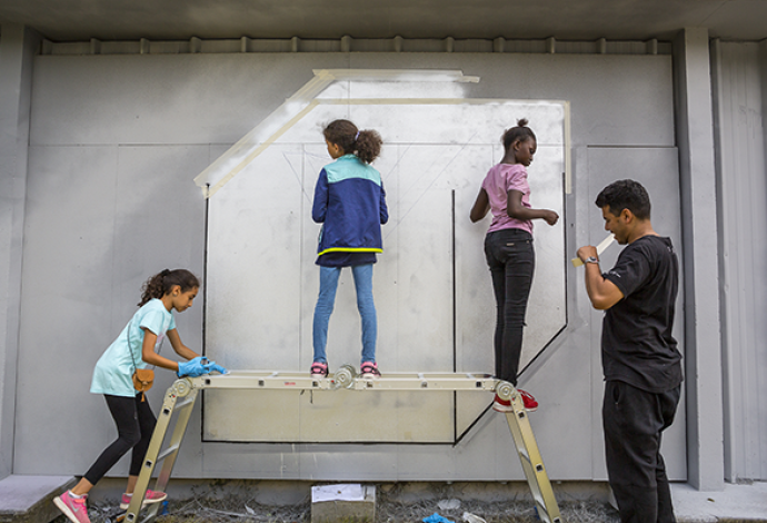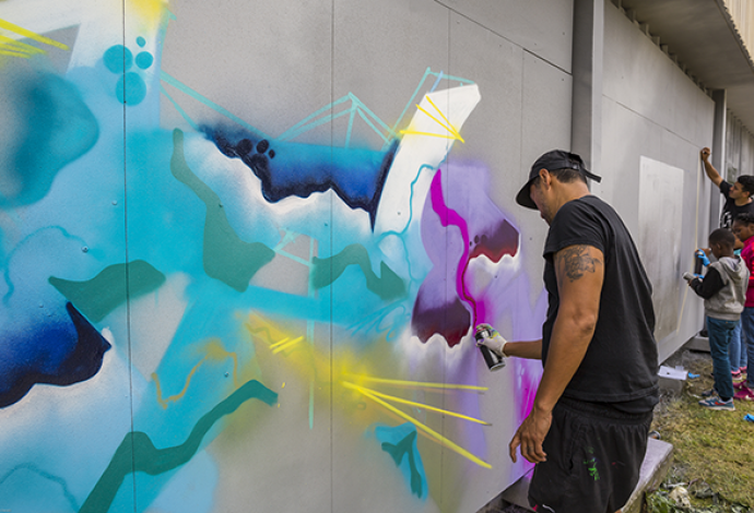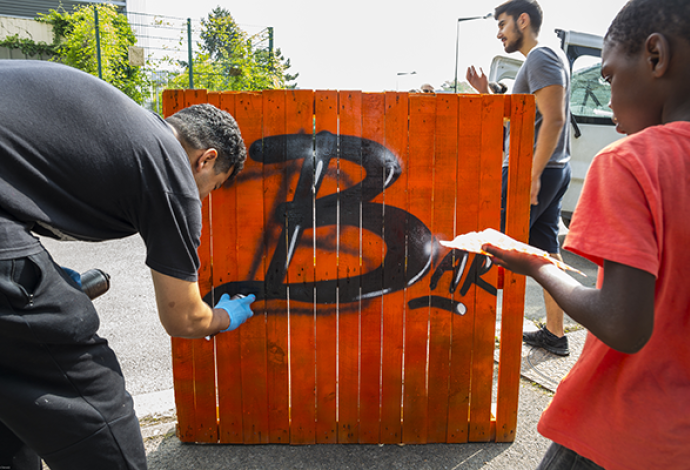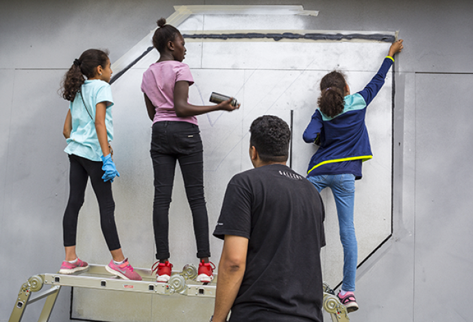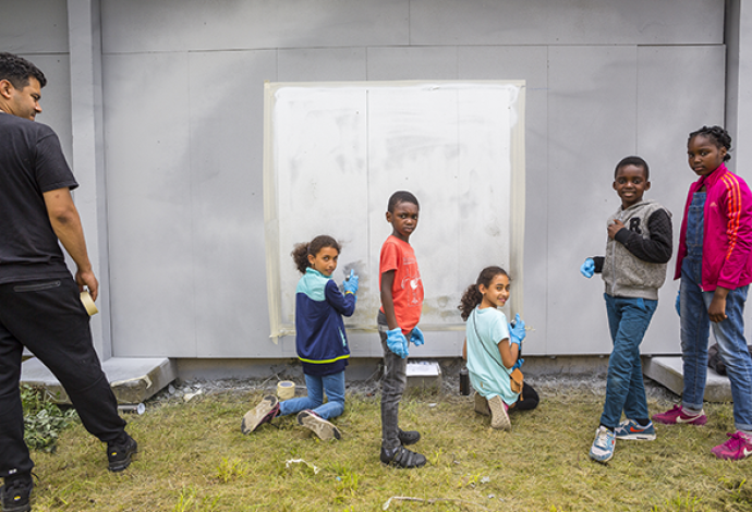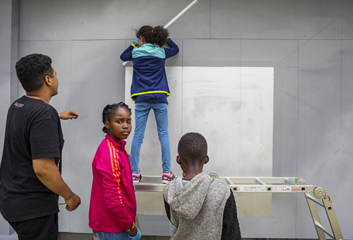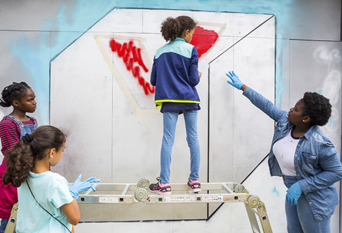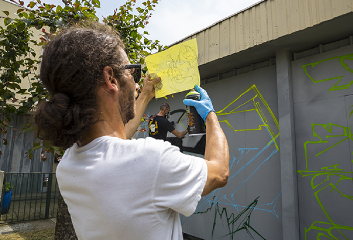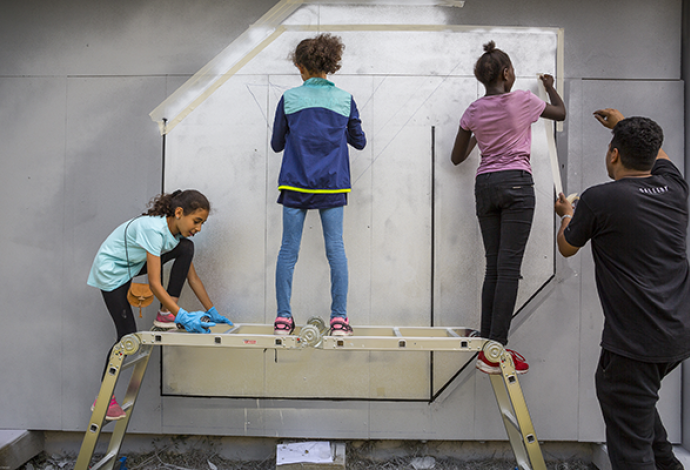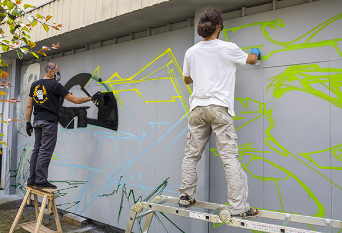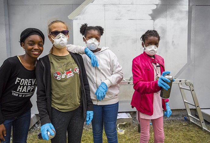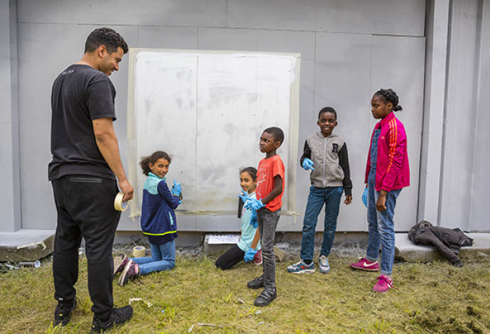 Piloté par l’association The Hundreds, le projet Evo’piscine a permis d'associer des Villetaneusiens pour créer ensemble des fresques géantes éphémères sur la façade de l’ancien centre nautique qui va être rénové en lieu culturel transitoire.
