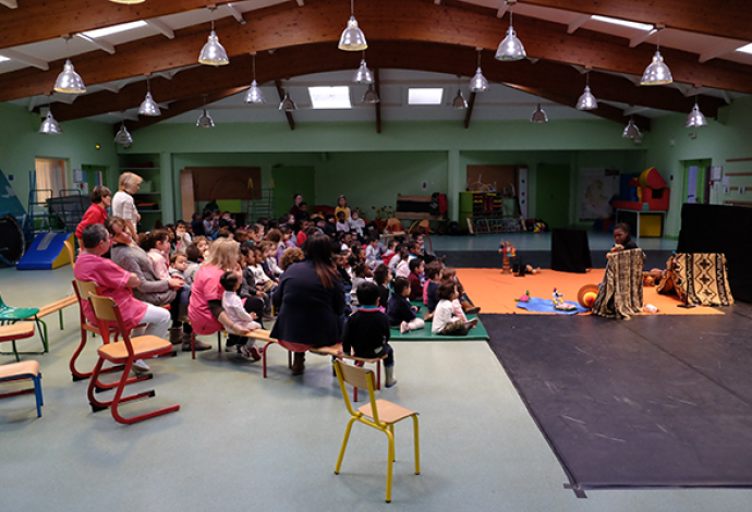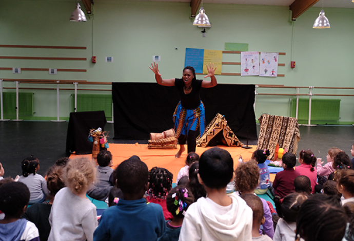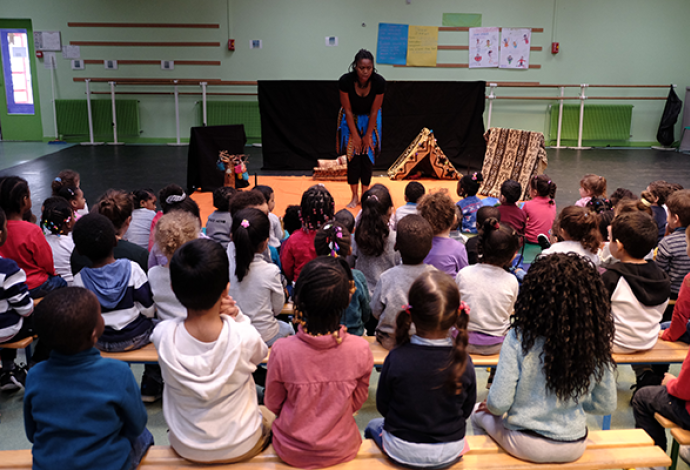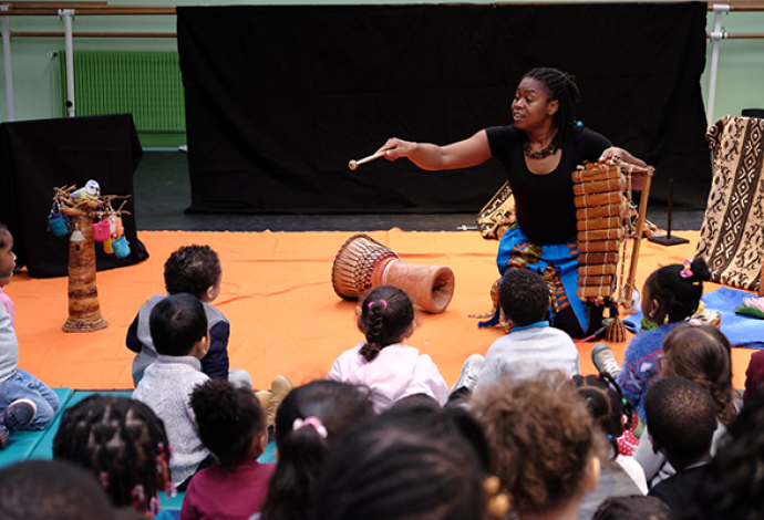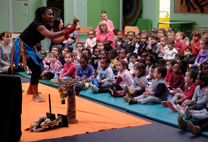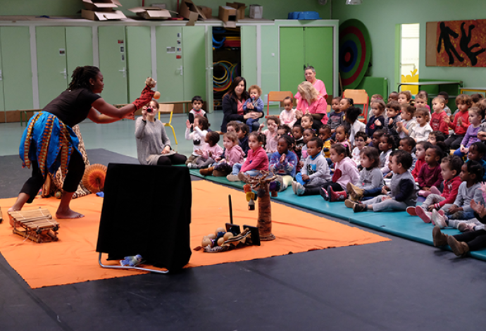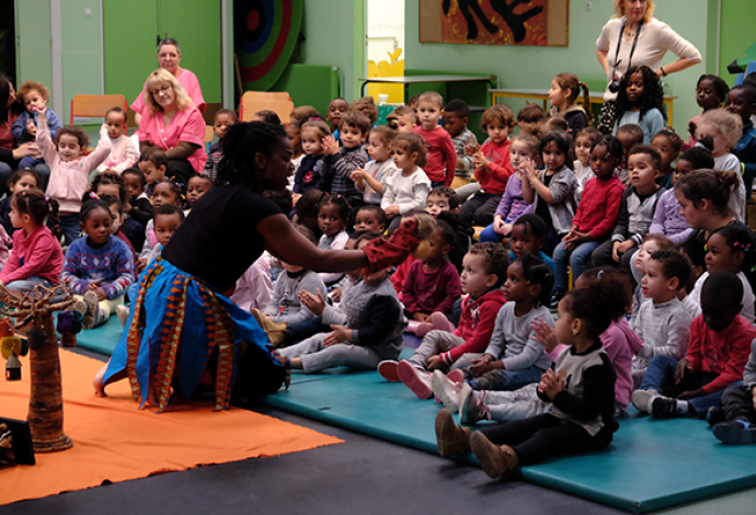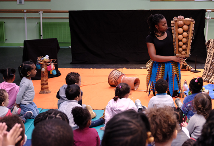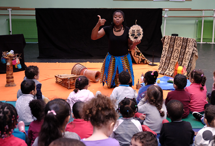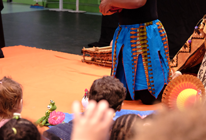 Les enfants des écoles (ici la maternelle Anne-Frank) ont voyagé en savane africaine pour suivre un bébé lion nommé Sambo avec la conteuse et musicienne Bibata Roamba qui leur a aussi présenté ses instruments : djembé, balafon et zanza…