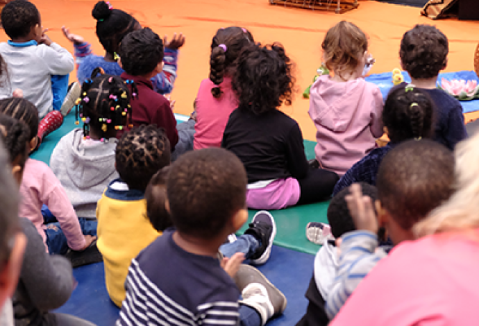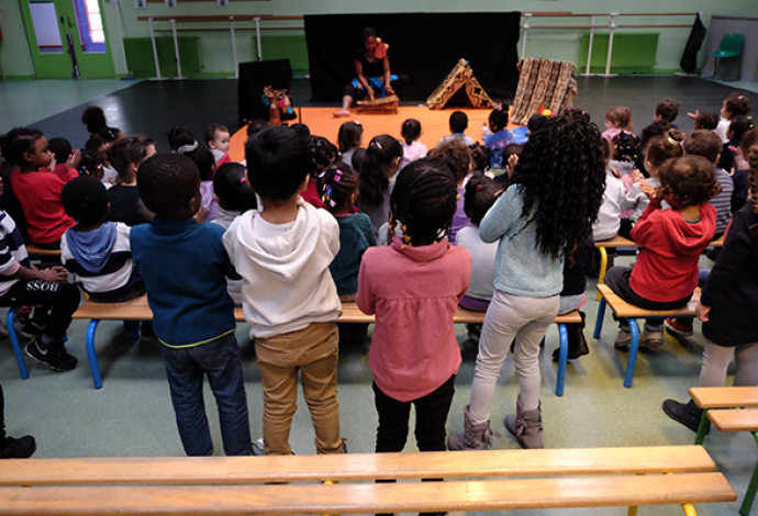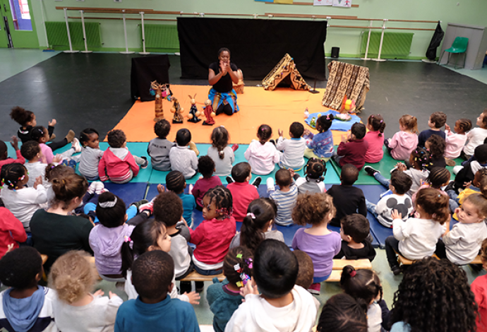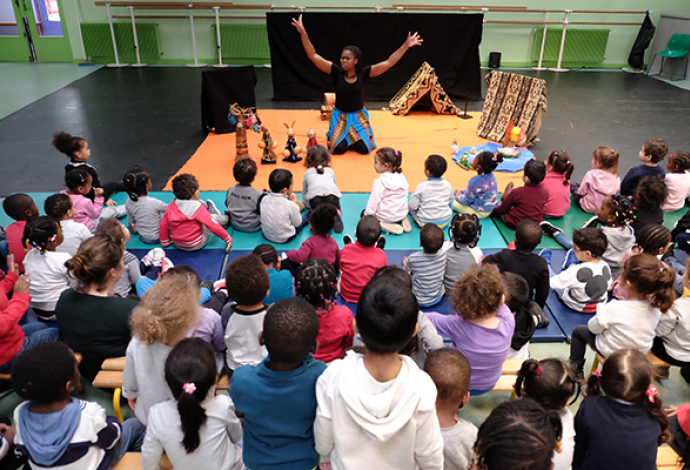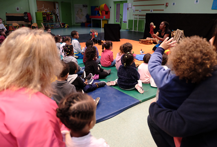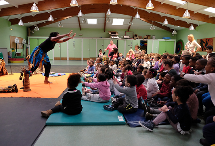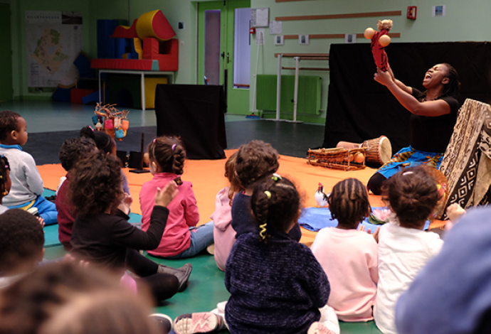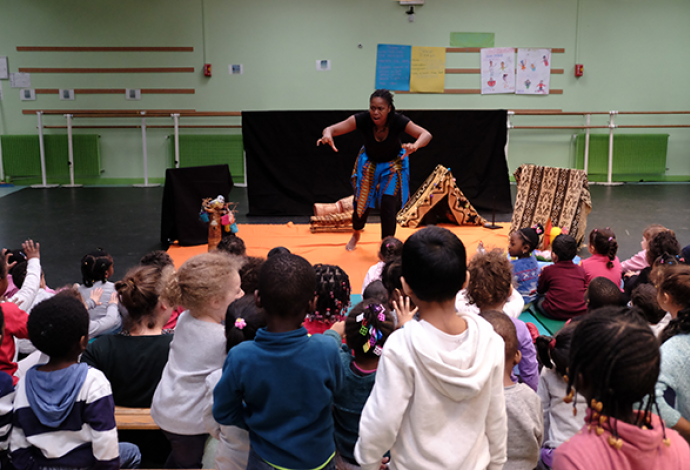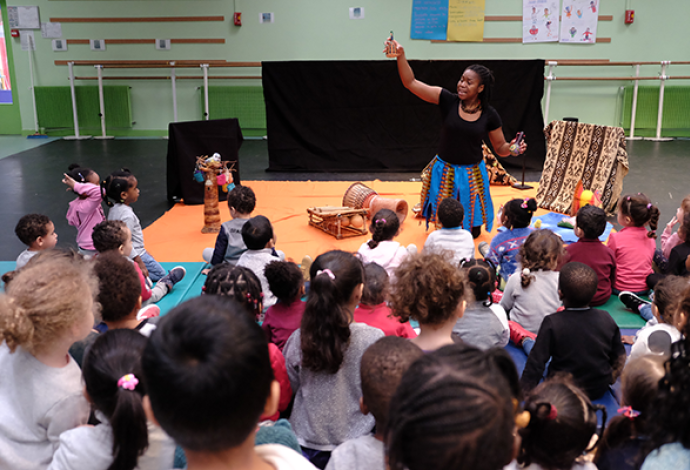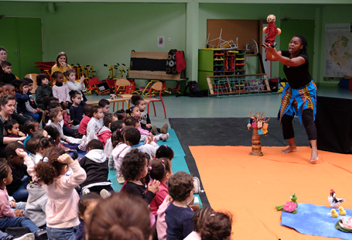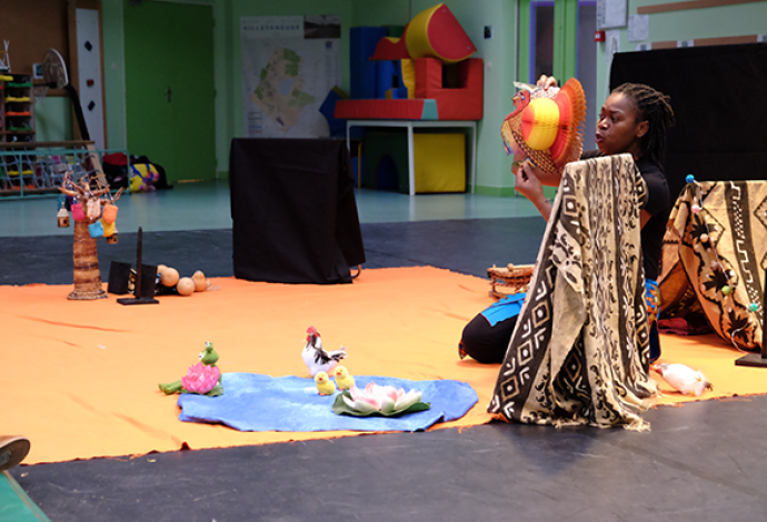 Les enfants des écoles (ici la maternelle Anne-Frank) ont voyagé en savane africaine pour suivre un bébé lion nommé Sambo avec la conteuse et musicienne Bibata Roamba qui leur a aussi présenté ses instruments : djembé, balafon et zanza…