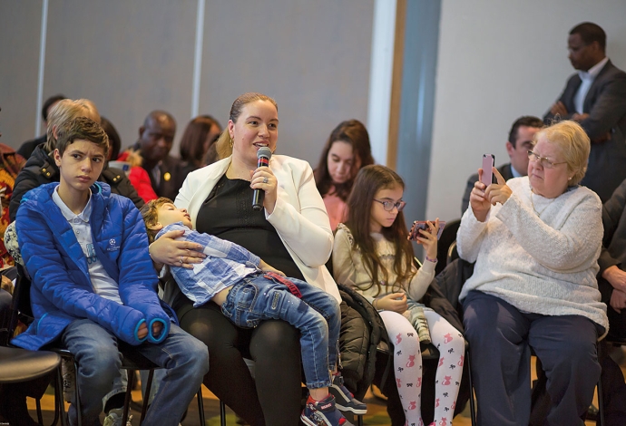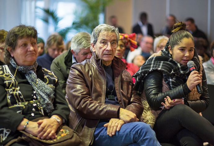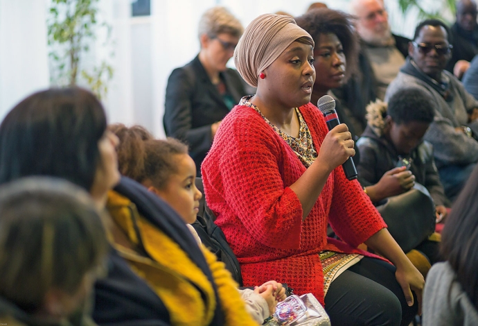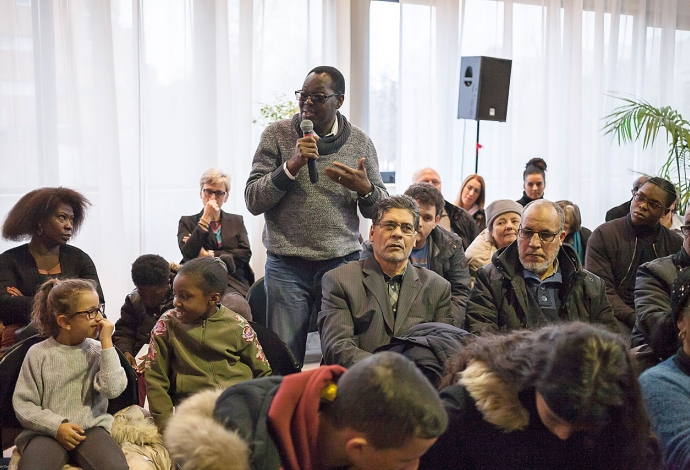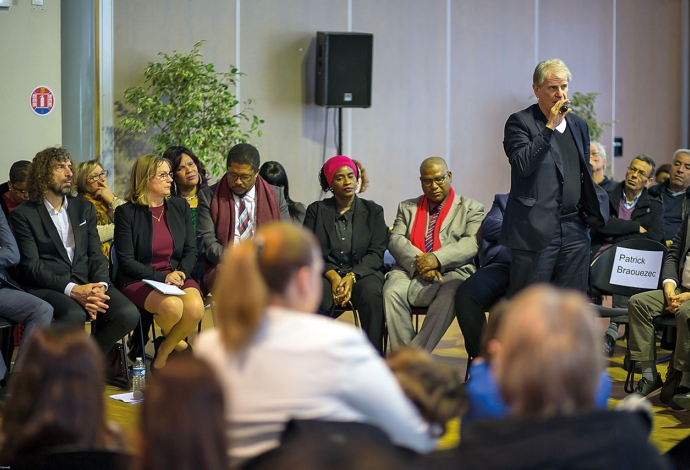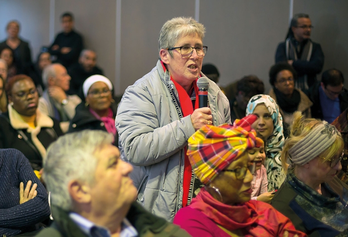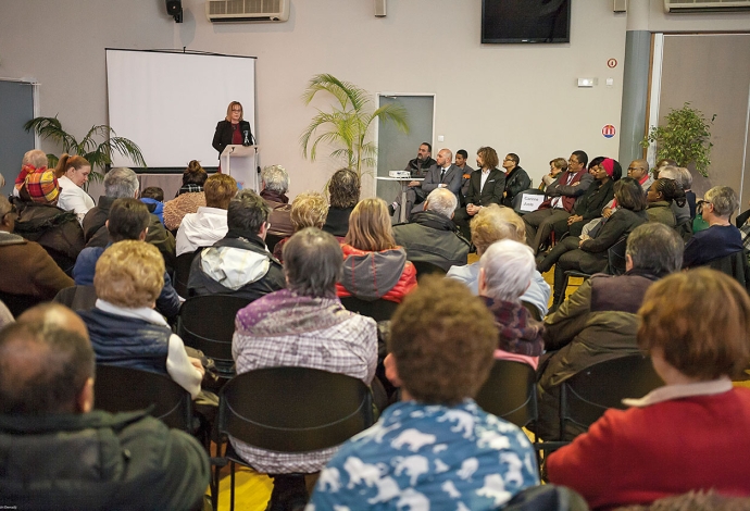 Salle comble à l’Hôtel de ville pour la deuxième édition de « Villetaneuse, parlons-en », moment de restitution concernant les réalisations municipales et d’échanges sur le reste à réaliser entre les Villetaneusien.nes et Carinne Juste, la maire, et son équipe.