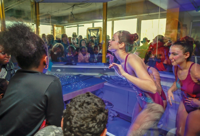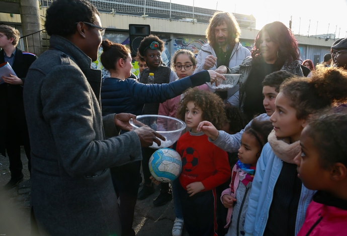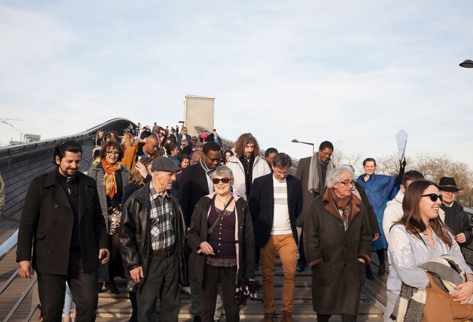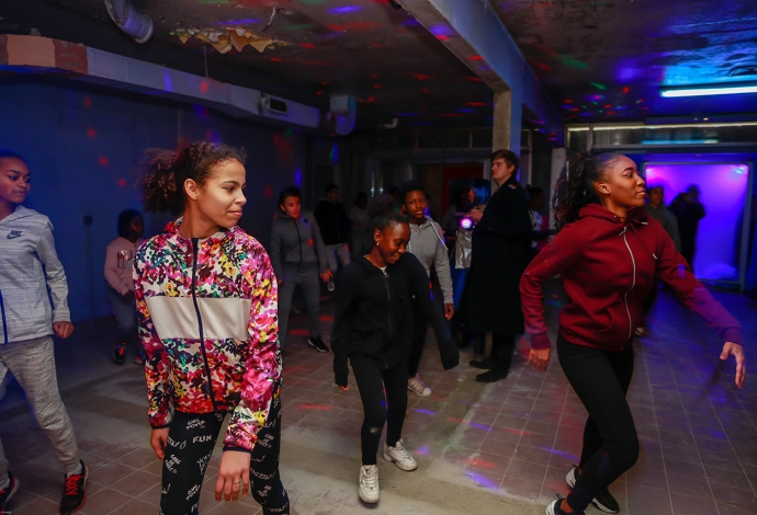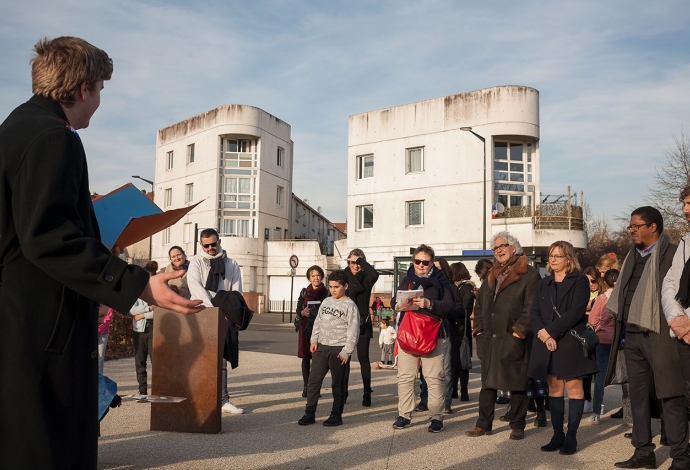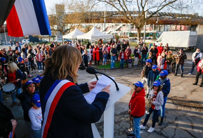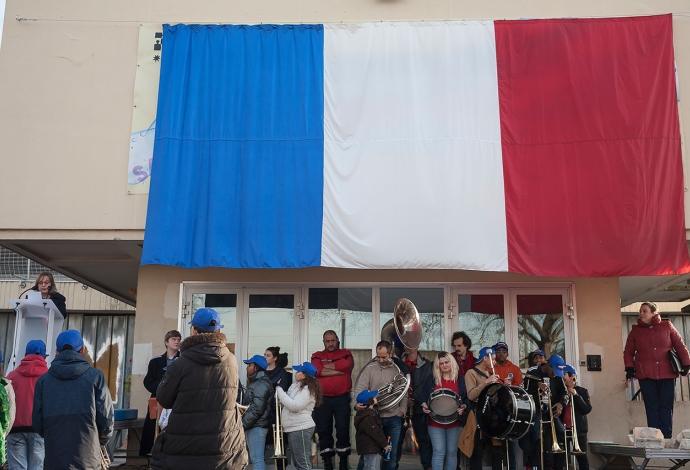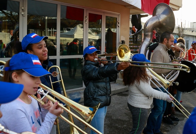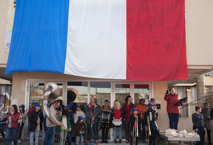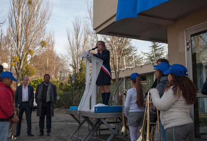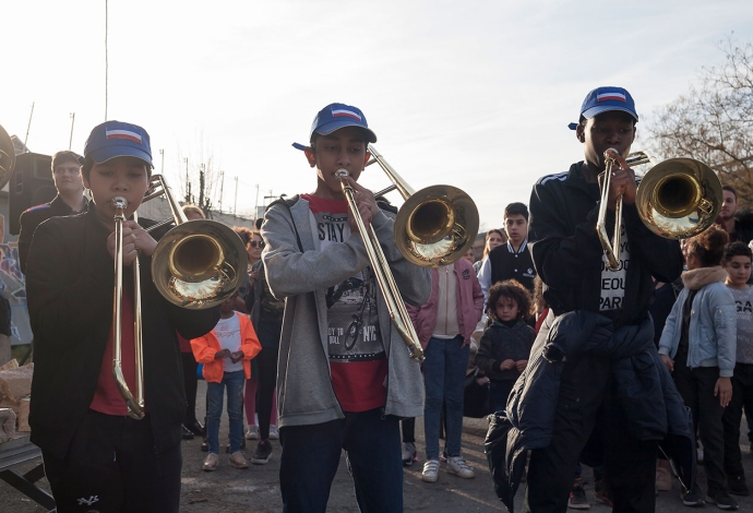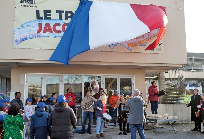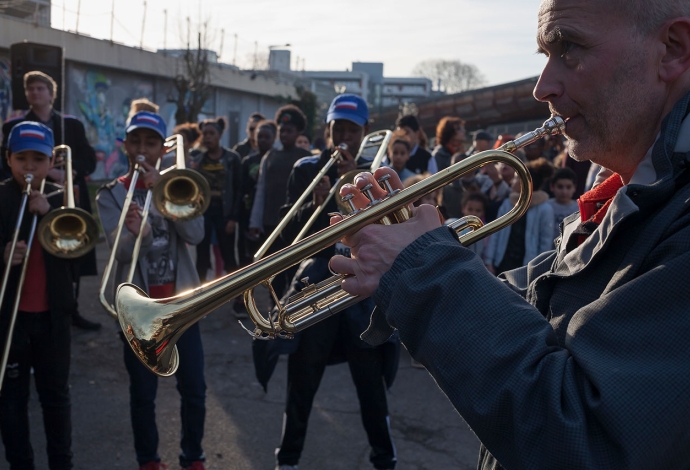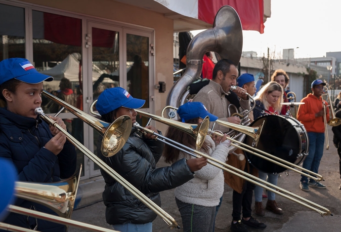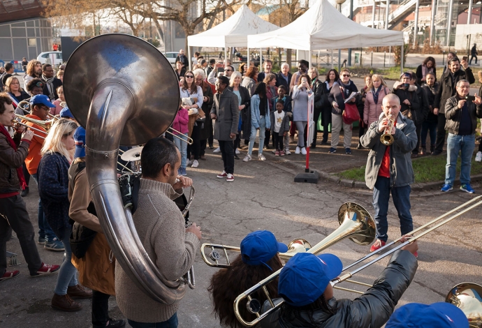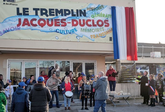 La Fabrique Orchestrale Junior (FOJ) avec son Brass Band était là pour le baptême de ce nouveau lieu culturel à Villetaneuse. Chaque participant s'est vu remettre symboliquement une première pierre et une clé. Alors que Carinne Juste, le maire, précisait "Nous mettons ce lieu entre les mains des citoyens (...) un lieu de démocratie et de participation où chacun construit une oeuvre collective". Tout le monde a pu ensuite entrer dans le "Tremplin Jacques-Duclos", endroit inédit encore en chantier, pour assister à une mise en scène originale de la compagnie de la Pierre Noire, impliquant des danseuses aquatiques de Bondy et des danseurs hip hop du CICA.
