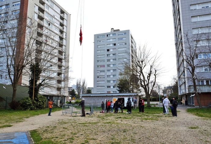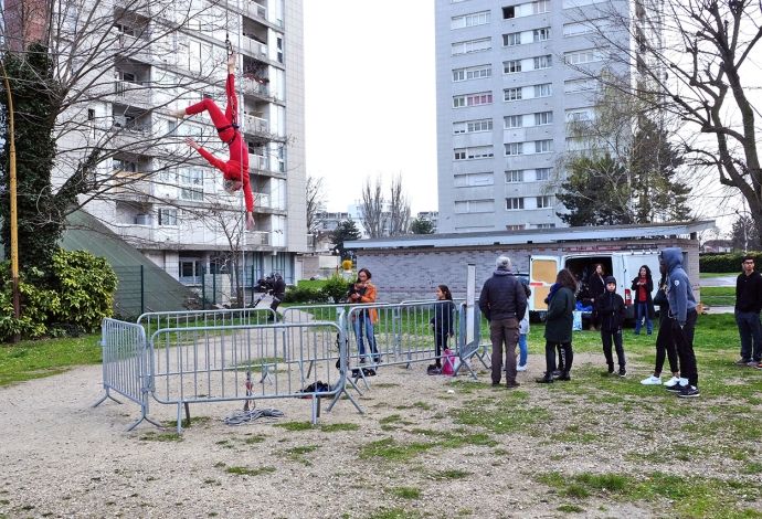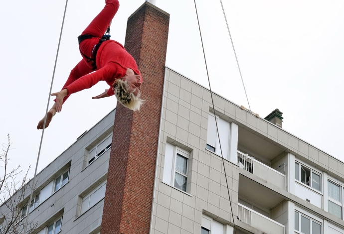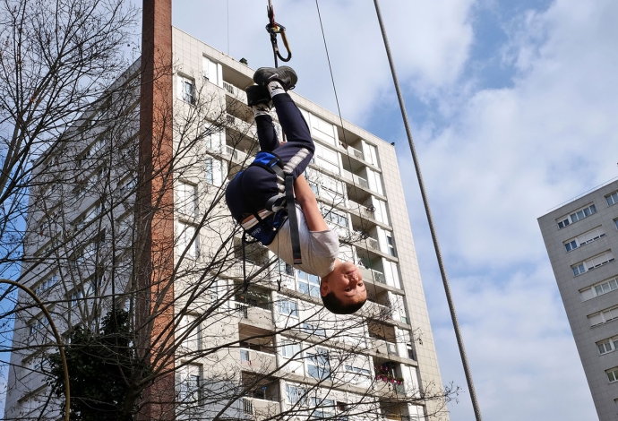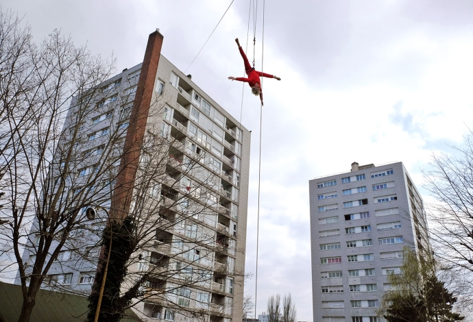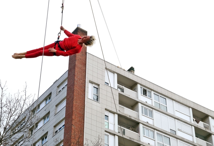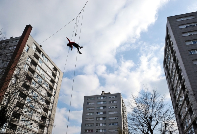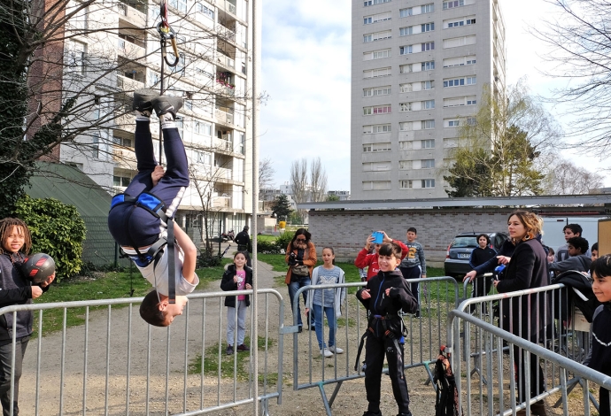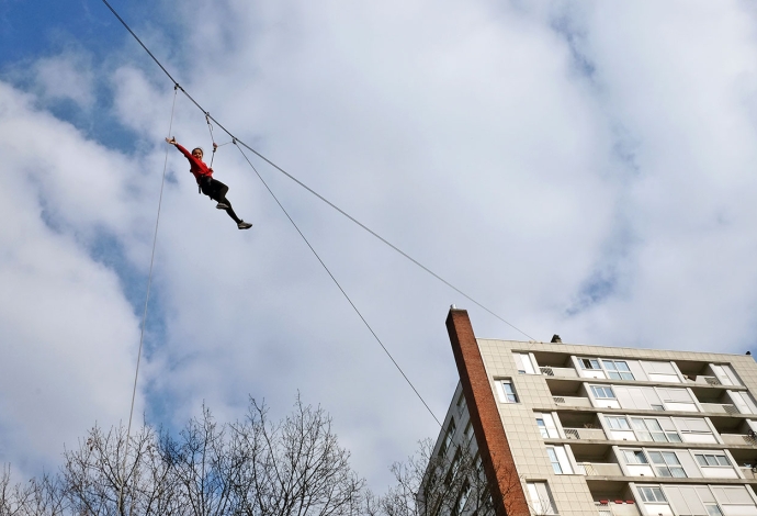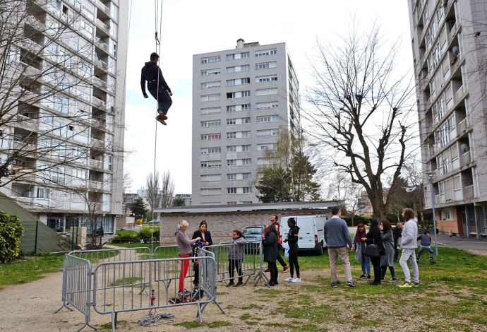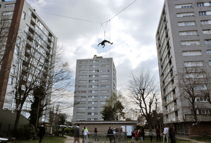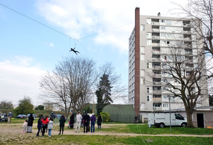 La vue devait être imprenable pour ces téméraires Villetaneusiens, hissés à la force des bras des autrs participants pour s'élever à plusieurs dizaines de mètres du sol, maintenu par un câble tendu entre deux immeubles de la cité Saint-Leu ! ce dispositif décoiffant était à l'oeuvre de la Compagnie Retouramont à l'initiative plusieurs rendez-vous verticaux en ville.