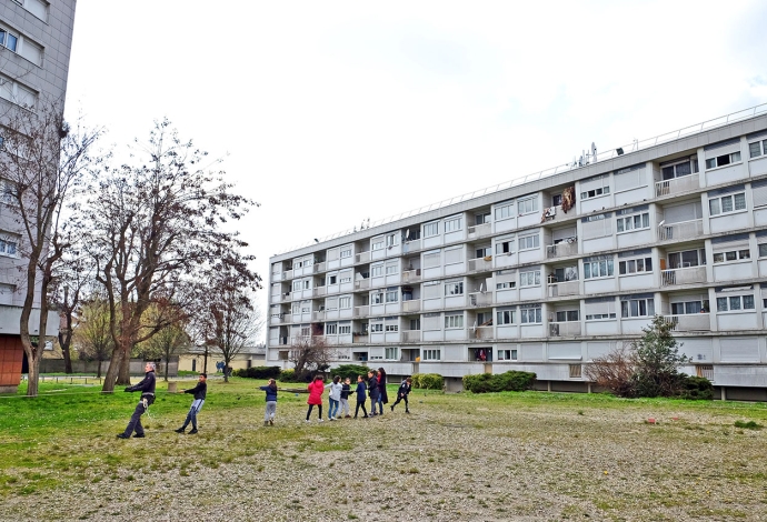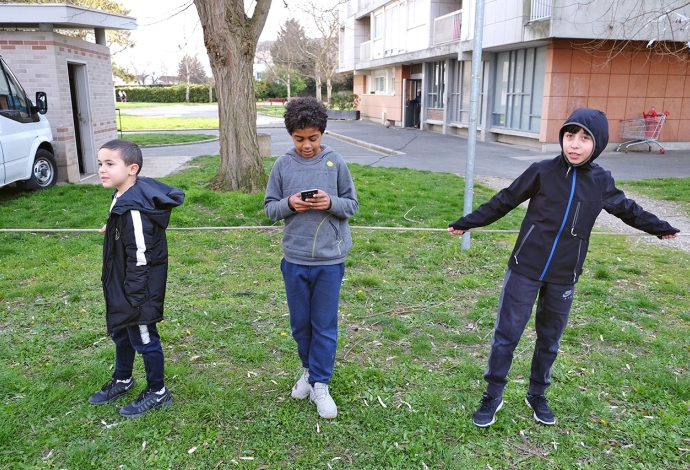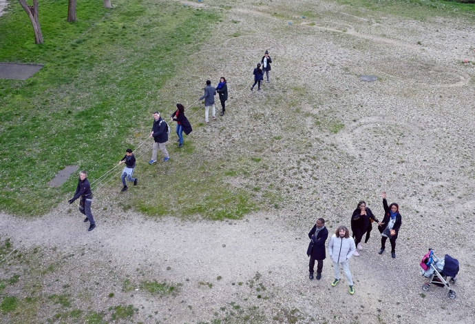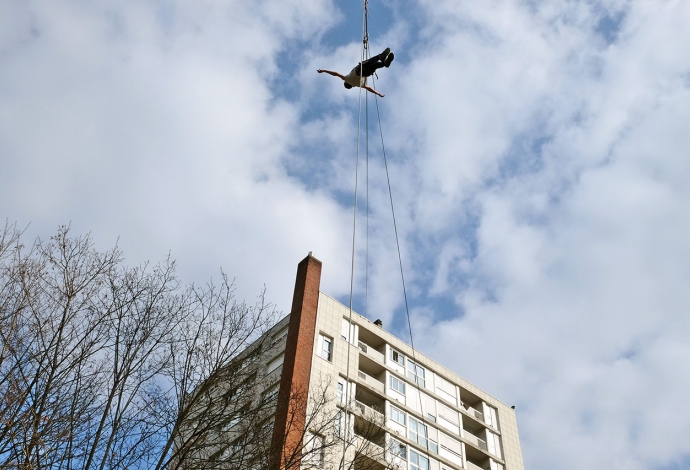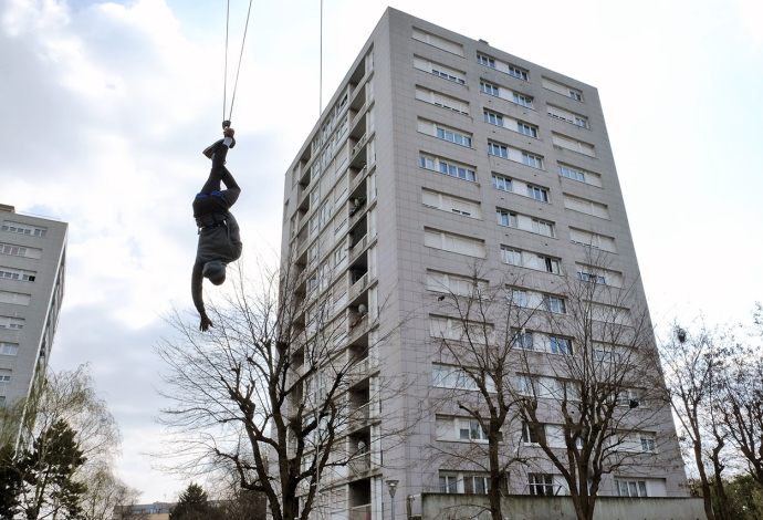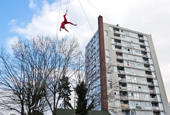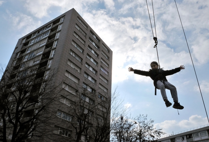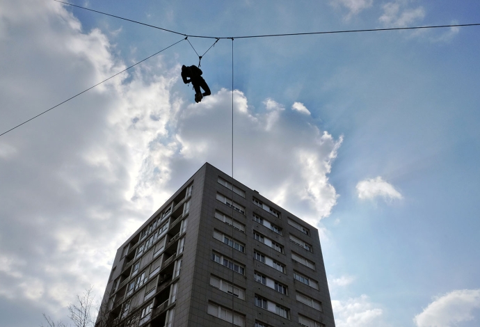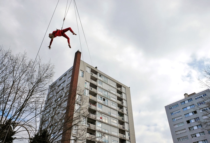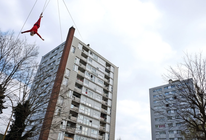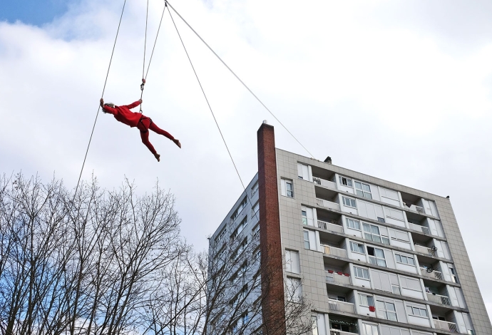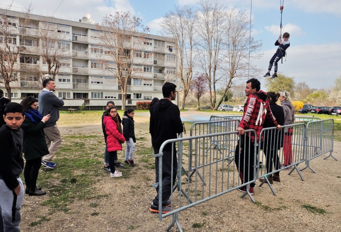 La vue devait être imprenable pour ces téméraires Villetaneusiens, hissés à la force des bras des autrs participants pour s'élever à plusieurs dizaines de mètres du sol, maintenu par un câble tendu entre deux immeubles de la cité Saint-Leu ! ce dispositif décoiffant était à l'oeuvre de la Compagnie Retouramont à l'initiative plusieurs rendez-vous verticaux en ville.
